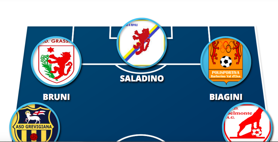 In avanti c’è l’imbarazzo della scelta: maglia n.9 sulle spalle del ripolese Saladino, autore di una tripletta e per la prima volta nella nostra Top. Al suo fianco Bruni, bomber grassinese capocannoniere in Eccellenza. E l’ultima “camiseta” va a Biagini del Barberino.