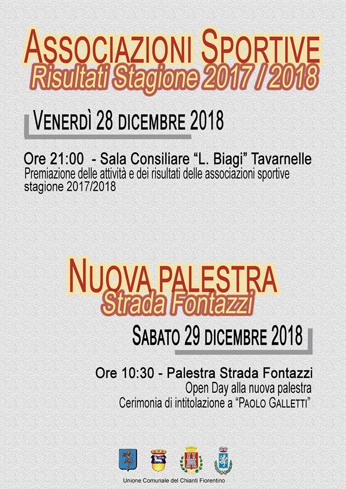 Venerdì 28 dicembre dalle 21, in sala consiliare “Luigi Biagi”, a Tavarnelle, premiazione delle attività e dei risultati delle associazioni sportive 2017/2018.