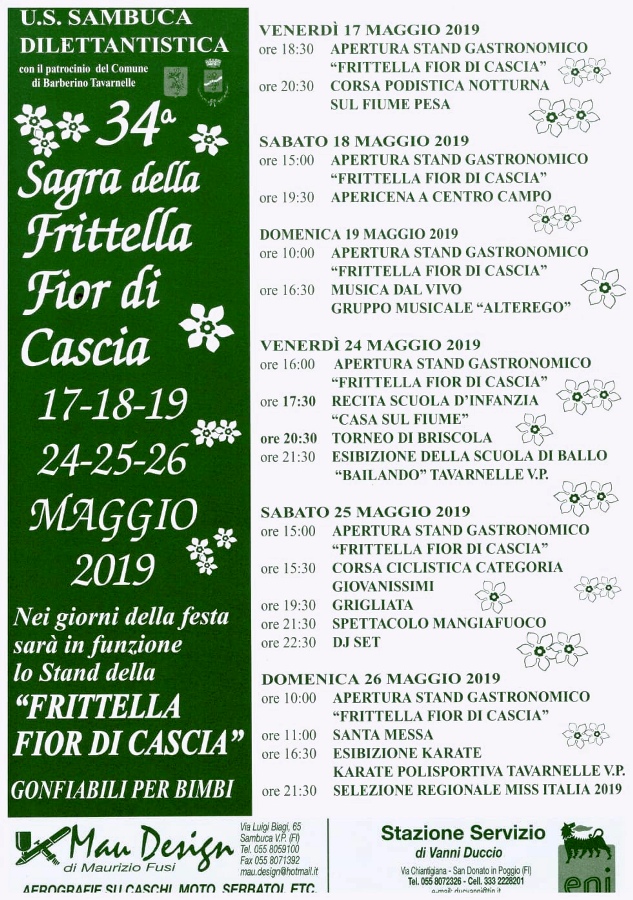 Qui sotto infatti vedete il programma completo dei due week end lunghi (17, 18 e 19 maggio; 24, 25 e 26 maggio) con la 34esima edizione della Sagra della Frittella Fior di Cascia.