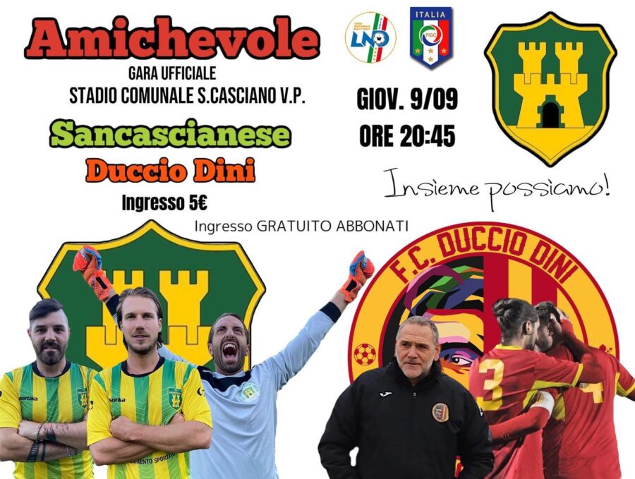 SAN CASCIANO – Non è un’amichevole come tutte le altre quella che domani, giovedì 9 settembre, vedrà scendere in campo al comunale di viale Garibaldi la Sancascianese e l’Fc Duccio Dini (oe 20.45).
