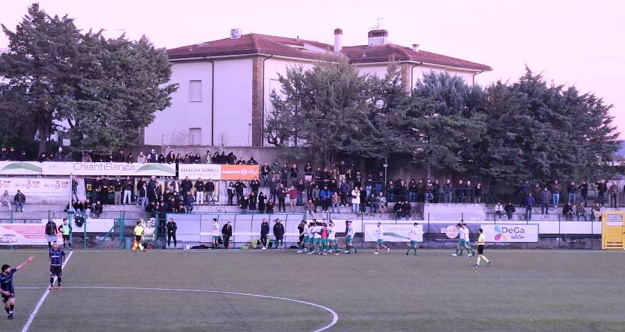 Si apre poi una fase di gara segnata soprattutto dalla tensione e dai tanti fischi arbitrali: fino all’81’, quando arriva il raddoppio gialloverde: corner di Pratesi che scende il secondo palo dove riesce, nella confusione, a colpire Magnelli che viene però fermato dal palo; nel batti e ribatti che si crea emerge però Lumachi, che riesce a trovare il varco vincente per concludere a rete e siglare il 2-0 della Sancascianese.