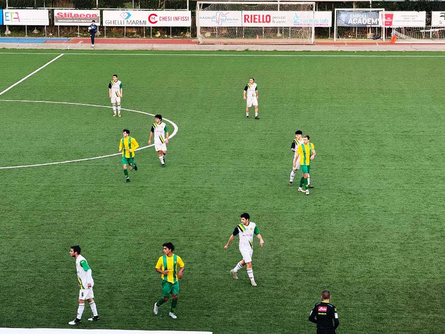 Parte bene la squadra gialloverde, che al 4’ calcia una punizione dal limite con Lumachi. Tiro rasoterra sotto la barriera a sorprendere il portiere ma Pulidori è attento e blocca in tuffo.