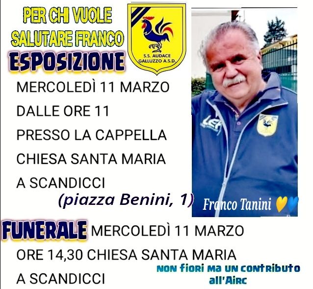 GALLUZZO – “In queste ore moltissimi messaggi di cordoglio e di affetto stanno arrivando all’Audace Galluzzo per la prematura scomparsa, a soli 70 anni, del nostro vicepresidente Franco Tanini“.
